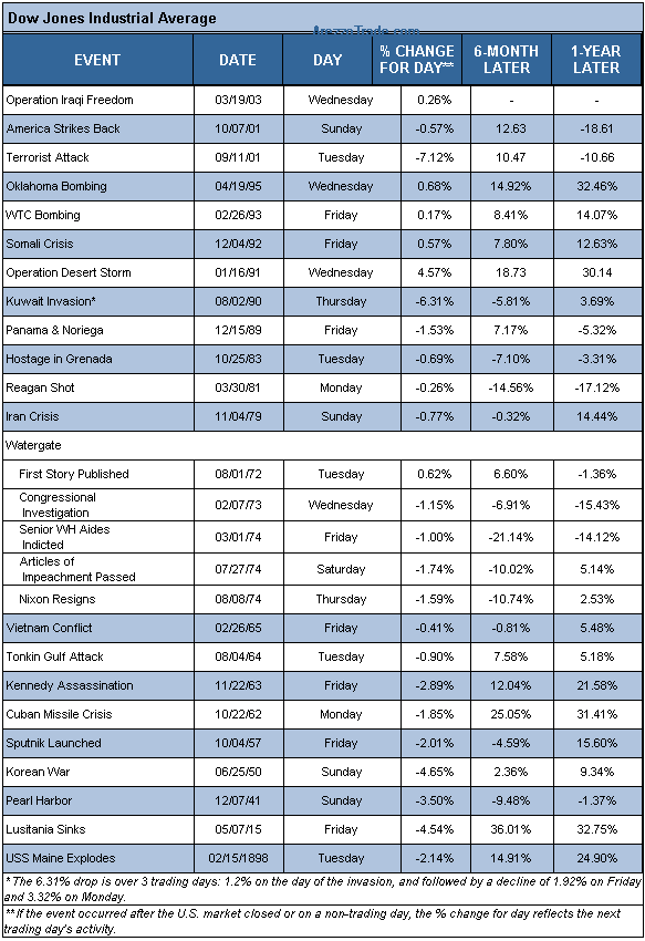 Durante la Seconda Guerra Mondiale, il Dow Jones Industrial Average subì due grossi colpi che lo tennero in crisi per la maggior parte del periodo del conflitto. Il primo colpo fu all'inizio del 1940, quando le armate di Adolf Hitler erano in marcia. L'allarme causato dall'aggressione spinse il DJIA verso una delle più ripide discese della sua storia, facendolo scivolare del 23% in appena due settimane. Da un massimo di 148.17 del 9 maggio, l'indice scese sino a 113.94 il 24 maggio. Il mercato, che era stato forte, divenne nervoso dopo che le armate Naziste invasero la Danimarca e la Norvegia nell'aprile del 1940, molti mesi dopo che la Germania aveva conquistato la Polonia. Il Wall Street Journal notò che "il mercato azionario attuale è carico di dinamite psicologica pronta ad esplodere". Il 9 maggio. il Journal scrisse che l'invasione dell'Olanda "avrebbe portato timori che anche l'Inghilterra potesse essere attaccata". Il giorno seguente le armate di Hitler entrarono nei Paesi Bassi di Olanda, Belgio e Lussemburgo ed avevano la strada spianate per una facile e rapida vittoria in Francia. Nel mezzo di questo declino, il giornale "Abreast of the Market" riportò che "nonostante molti frequentatori di Wall Street osservino che una intensa attività di guerra sarebbe stimolante per le industrie statunitensi.... riconoscono i pericoli che potrebbero derivare da una vittoria della Germania Nazista". All'11 giugno, mentre l'invasione tedesca della Francia era in corso e mentre gli Inglesi erano stati costretti ad abbandonare le loro posizioni nel nordovest della Francia e del Belgio (Dunkirk), il Dow cambiò il suo corso e assunse un definito trend rialzista che rimase in essere per la parte rimanente dell'anno. "Una volta che lo shock iniziale della caduta della Linea Maginot venne assorbito, ci fu una ripresa" disse lo storico Robert Sobel, storico della Hofstra University. Lo storico dell'economia Richard Sylla, della New York University, aggiunse che una volta che la battaglia di Inghilterra ebbe inizio, divenne chiaro che la Royal Air Force sarebbe stata in grado di difendere l'Inghilterra, così gli investitori americani si resero conto che "non si sarebbero svegliati il giorno seguente scoprendo che l'Inghilterra era caduta". Comunque, più di un anno dopo la guerra era entrata nel pieno dello sviluppo e ciò rimise il mercato in trend ribassista di lungo periodo. Il 7 dicembre 1941, i giapponesi bombardarono la base navale statunitense di Pearl Harbor, alle Hawaii, e ciò porto gli Stati Uniti in guerra. Il Presidente Franklin D. Roosevelt la chiamò "la giornata della infamia" ed il mercato azionario scese del 3.5% durante la seduta dell'8 dicembre, chiudendo a 112.52 punti rispetto ai 116.60 del giorno precedente. Rimase in downtrend per 5 mesi. Sino agli eventi di Pearl Harbor molti americani pensavano che gli Stati Uniti avrebbero evitato un impegno diretto nella guerra, ma l'attacco giapponese rese impossibile quella ipotesi. L'attacco prese di sorpresa sia le forze militari USA sia il mercato azionario. La rubrica "Abreast of the Market" del Wall Street Journal descrisse la situazione in questo modo: "L'avvio delle attività ostili tra Giappone e Stati Uniti è arrivato dopo la chiusura di una settimana borsistica nella quale i titoli hanno messo a segno le migliori performances registrate negli ultimi mesi. Nonostante esistesse tensione nelle relazioni tra Stati Uniti e Giappone, il Mercato scommetteva sul fatto che i negoziati tra Washington e Tokyo potessero portare a sviluppi positivi" Uno delle preoccupazioni principali che il mercato aveva era il come la guerra sarebbe stata finanziata. Appariva ovvio che l'amministrazione Roosevelt avrebbe alzato le tasse, aumentato il debito verso i paesi esteri od entrambe le cose. Questa spiacevole situazione venne descritta dal Journal come "un'ombra che stava penzolante all'orizzonte". Dal lato positivo, però, l'entrata in guerra degli USA avrebbe significato "riassettare la macchina produttiva per ottimizzare ed assicurare la massima produzione per sconfiggere il nemico" come il Journal scrisse nella prima pagina. Alcuni economisti asseriscono che fu proprio la guerra a spinger fuori gli Stati Uniti dalla depressione cominciata all'inizio degli anni Trenta. Il DJIA continuò a scendere sino a raggiungere il minimo nel tardo aprile 1942. a 92.92 punti. Dopodiché cominciò a recuperare ed a salire. Verso la fine del 1942 era già a 119.40 ed alla fine del 1945, l'anno in cui la guerra terminò, raggiunse i 192.91 punti. Durante gli anni seguenti, quel pattern composto da una discesa iniziale seguita da un rimbalzo è stato il pattern tipico che si è registrato sul mercato in corrispondenza di tutti i conflitti a cui gli Stati Uniti hanno preso parte. | ||||