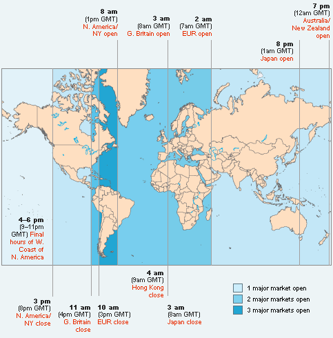 Il mercato Forex è aperto 24 ore su 24. Il trading comincia ogni giorno sul mercato di Sydney e si sposta intorno al globo via via che la giornata lavorativa comincia in ciascun centro finanziario. In sequenza abbiamo prima Sydney, poi Tokyo, Londra ed infine New York. Al contrario dei mercati azionari (aperti solo alcune ore al giorno) nel mercato Forex gli investitori possono rispondere istantaneamente alle fluttuazioni causate da eventi economici, sociali e politici nel momento in cui essi avvengono - giorno e notte.