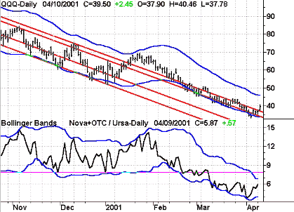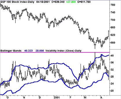 In contrast, readings at the lower Bollinger Band showed investors are relatively fearful, as assets in bullish funds dwindle and assets in the bearish fund rise, causing the (Nova+OTC)/Ursa ratio to decline. Readings near the lower band in late-November 2000, the beginning of 2001, and the beginning of April 2001 all proved excellent short-term buying opportunities, while the low readings in February and March proved too early against the steady downtrend in the first quarter of 2001. We seek to factor in the strength of the trend when making these contrarian selections, and we also tend to use stops to get us out of signals that aren't working as anticipated. This is due to the fact that when a high probability indicator like the RYDEX ratio is not working as anticipated, it tells you the market trend is likely to continue instead of reverse. Such is the case with good indicators: if they are right 8 out of 10 times consistently, the 2 times out of 10 that they are wrong likely tell you something about how the market is likely to act going forward as well.